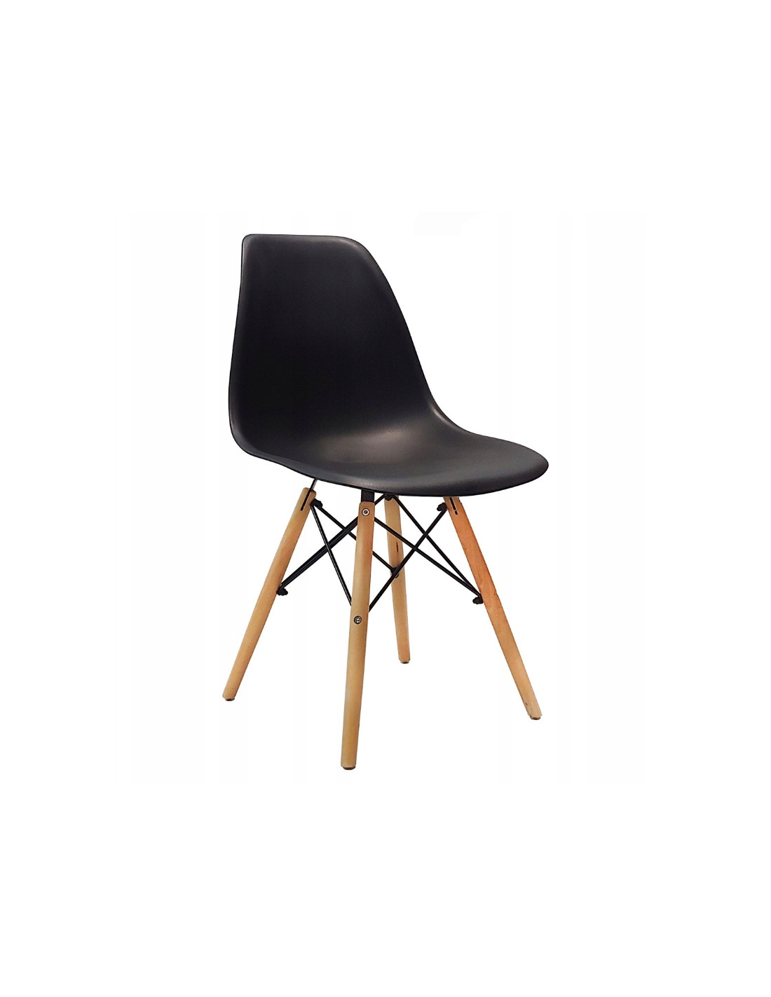Krzesło wykonane z polipropylenu, drewna naturalnego, oraz stali malowanej na czarno.