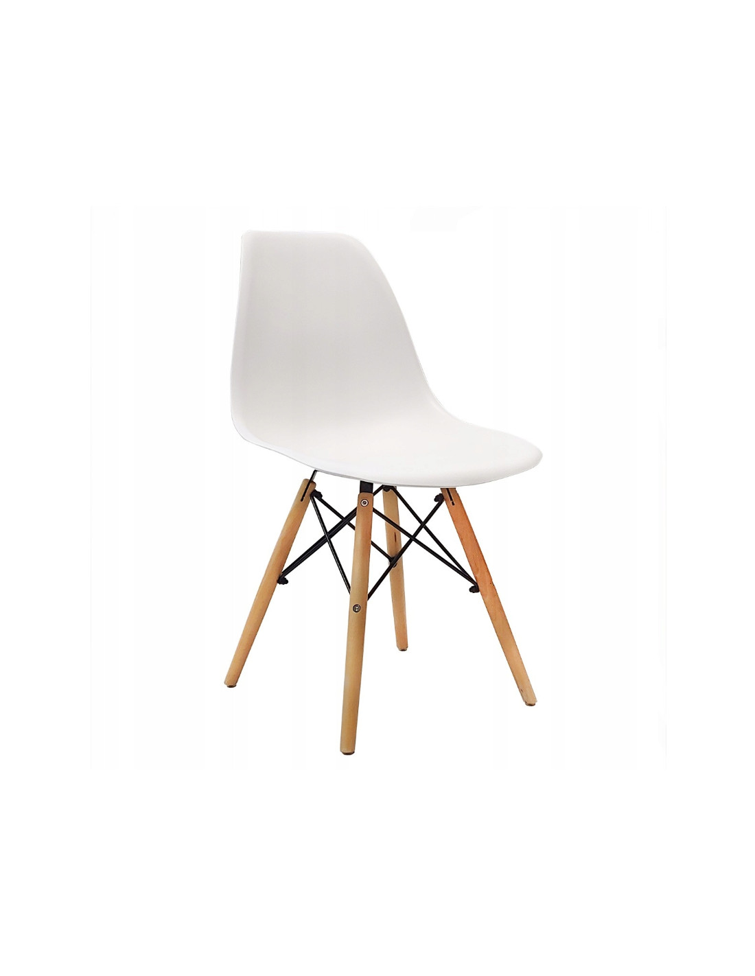 Krzesło wykonane z polipropylenu, drewna naturalnego, oraz stali malowanej na czarno.
