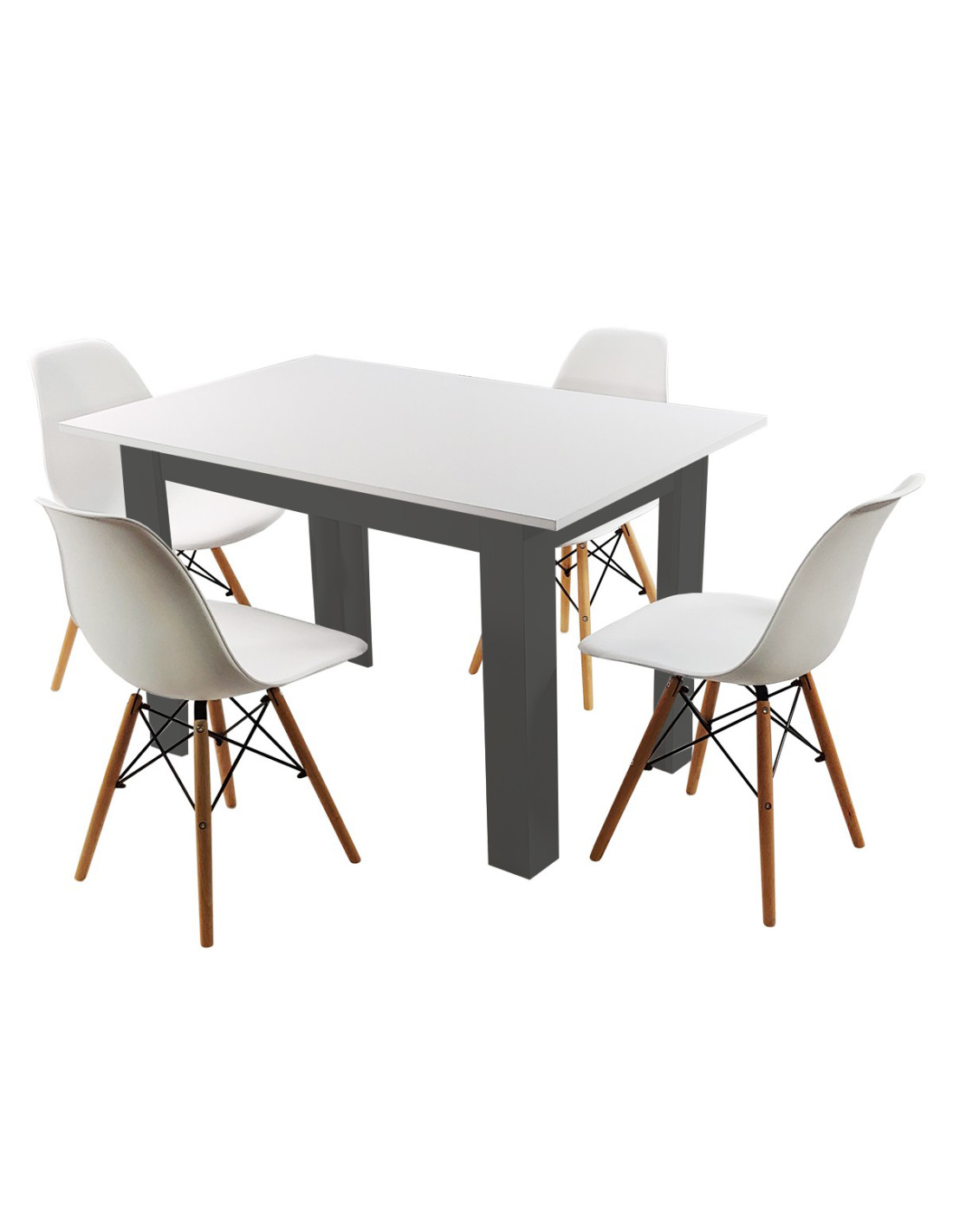 Wyjątkowo elegancki i niezwykle praktyczny zestaw stołowy sprawdzi się w klasycznych oraz nowoczesnych kuchniach lub jadalniach. Prostota wykonania to uniwersalna cecha, dzięki którym zestaw z powodzeniem sprawdzi się w różnych aranżacjach. Cechą wyróżniającą zestawu jest solidne i trwałe wykonanie. Zestaw składa się z prostokątnego stołu i 4 solidnych krzeseł. Stół wykonany jest z lakierowanej płyty MDF. Krzesła wykonane z polipropylenu, drewna naturalnego, oraz stali malowanej na czarno. Zestaw ten zwróci uwagę klientów ceniących uniwersalne i bardzo funkcjonalne rozwiązania.