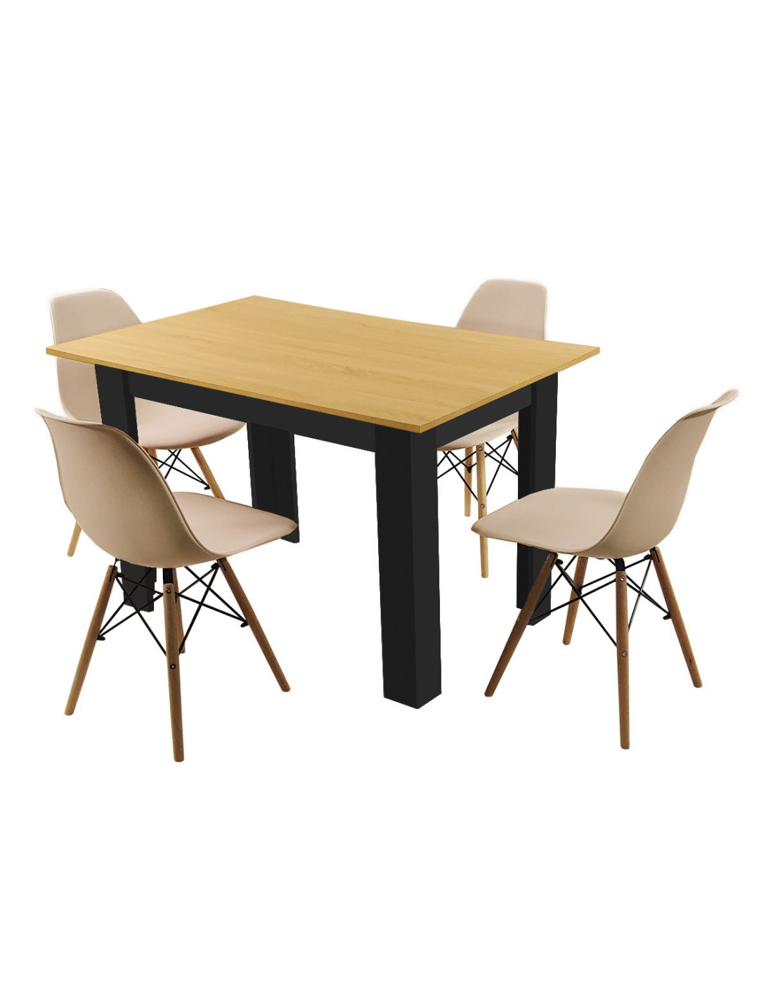 Wyjątkowo elegancki i niezwykle praktyczny zestaw stołowy sprawdzi się w klasycznych oraz nowoczesnych kuchniach lub jadalniach. Prostota wykonania to uniwersalna cecha, dzięki którym zestaw z powodzeniem sprawdzi się w różnych aranżacjach. Cechą wyróżniającą zestawu jest solidne i trwałe wykonanie. Zestaw składa się z prostokątnego stołu i 4 solidnych krzeseł. Stół wykonany jest z lakierowanej płyty MDF. Krzesła wykonane z polipropylenu, drewna naturalnego, oraz stali malowanej na czarno. Zestaw ten zwróci uwagę klientów ceniących uniwersalne i bardzo funkcjonalne rozwiązania.