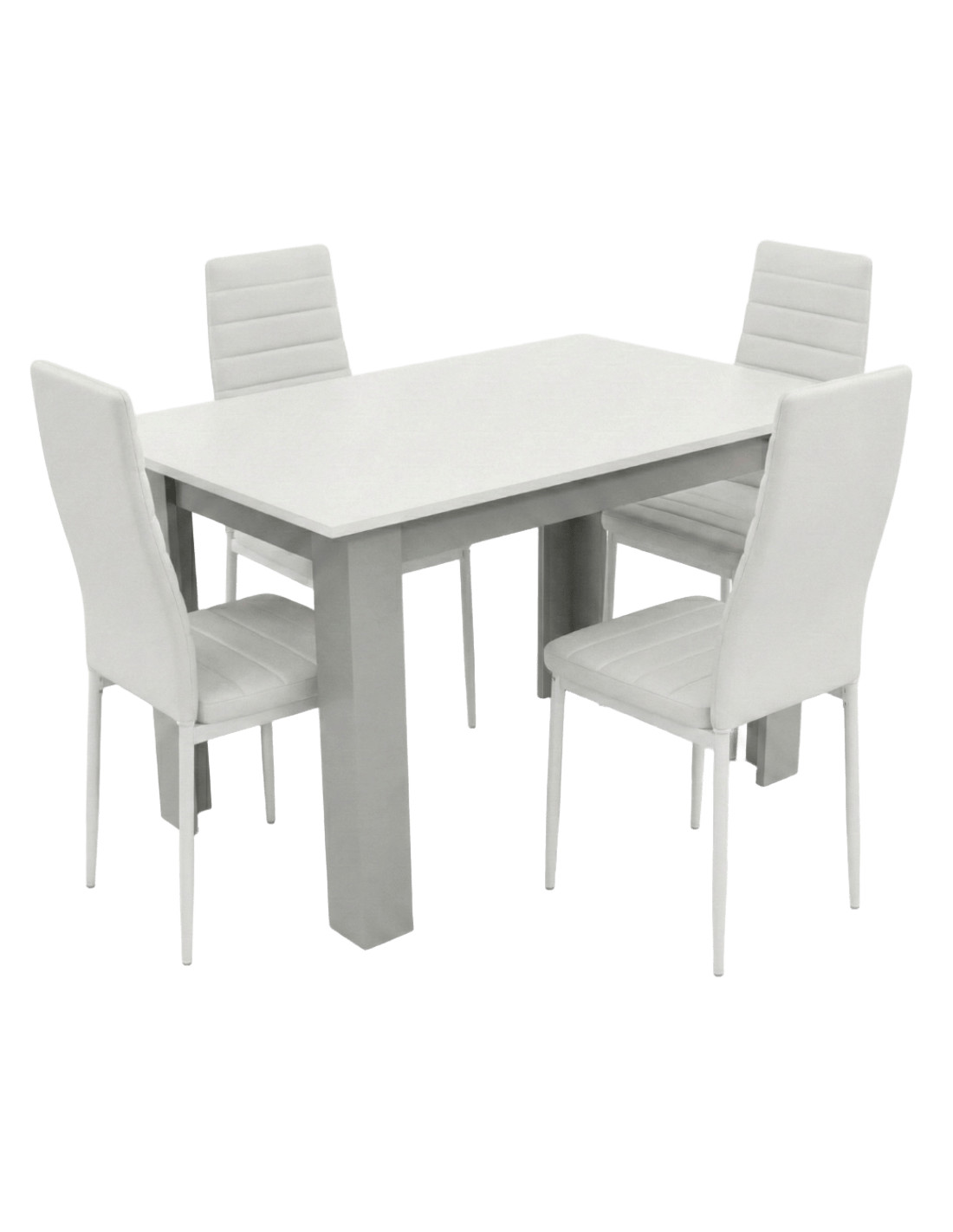 Wyjątkowo elegancki i niezwykle praktyczny zestaw stołowy sprawdzi się w klasycznych oraz nowoczesnych kuchniach lub jadalniach. Prostota wykonania to uniwersalna cecha, dzięki którym zestaw z powodzeniem sprawdzi się w różnych aranżacjach. Cechą wyróżniającą zestawu jest solidne i trwałe wykonanie. Zestaw składa się z prostokątnego stołu i 4 solidnych krzeseł. Stół wykonany jest z lakierowanej płyty MDF. W krzesłach zastosowano klasyczny stelaż wykonany z metalu w kolorze szarym, tapicerowany ekoskórą. Zestaw ten zwróci uwagę klientów ceniących uniwersalne i bardzo funkcjonalne rozwiązania.